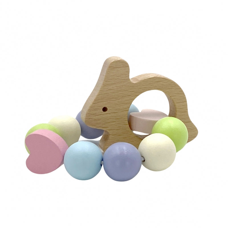 - 1x Houten rammelaar in de vorm van een konijntje, verbonden met kralen om te schuiven.