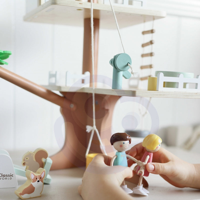 De set bevat 2 kinderfiguren, 2 dieren en prachtige accessoires, waaronder een wip, een schommel aan de tak, een emmer, een schatkist, een bed, een tafel en stoelen. Dit unieke huis zal je kind aanmoedigen om verhalen en avonturen te bedenken voor hun kleine poppen.