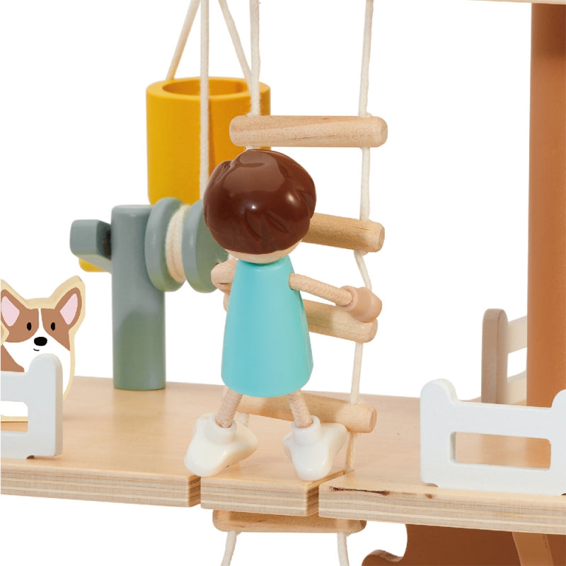 Dit unieke poppenhuis zal de fantasie van je kind prikkelen . Het huis is volledig functioneel . De jongen kan de emmer met een katrol voorttrekken, het meisje kan met de puppy spelen en de eekhoorn kan de dennenappel opeten. De poppen kunnen schommelen en via de ladder naar de boomhut klimmen.