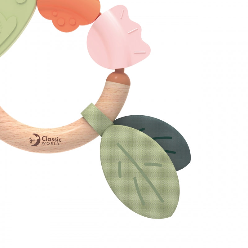 De combinatie van natuurlijk hout en zachte siliconen stimuleert de zintuigen en stimuleert de ontdekkingstocht, waardoor het een perfecte eerste bijtring en rammelaar is voor elk kleintje.