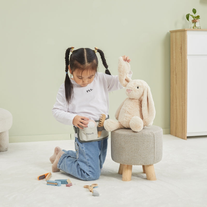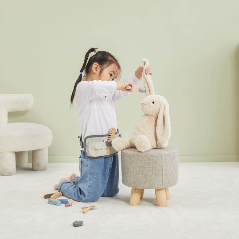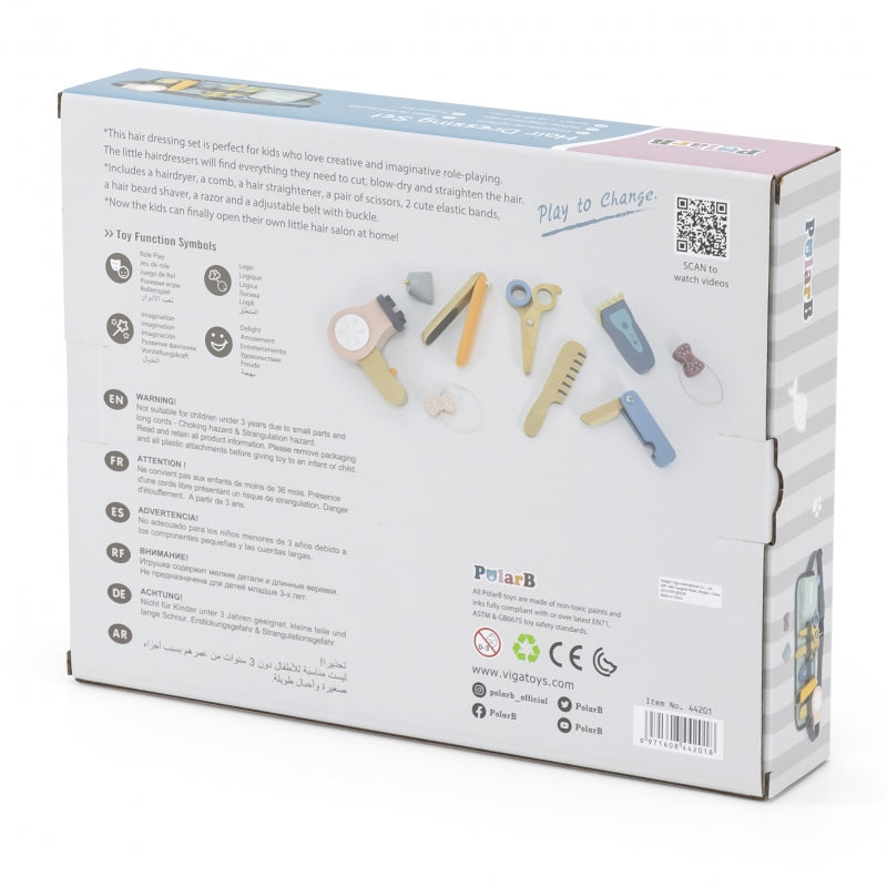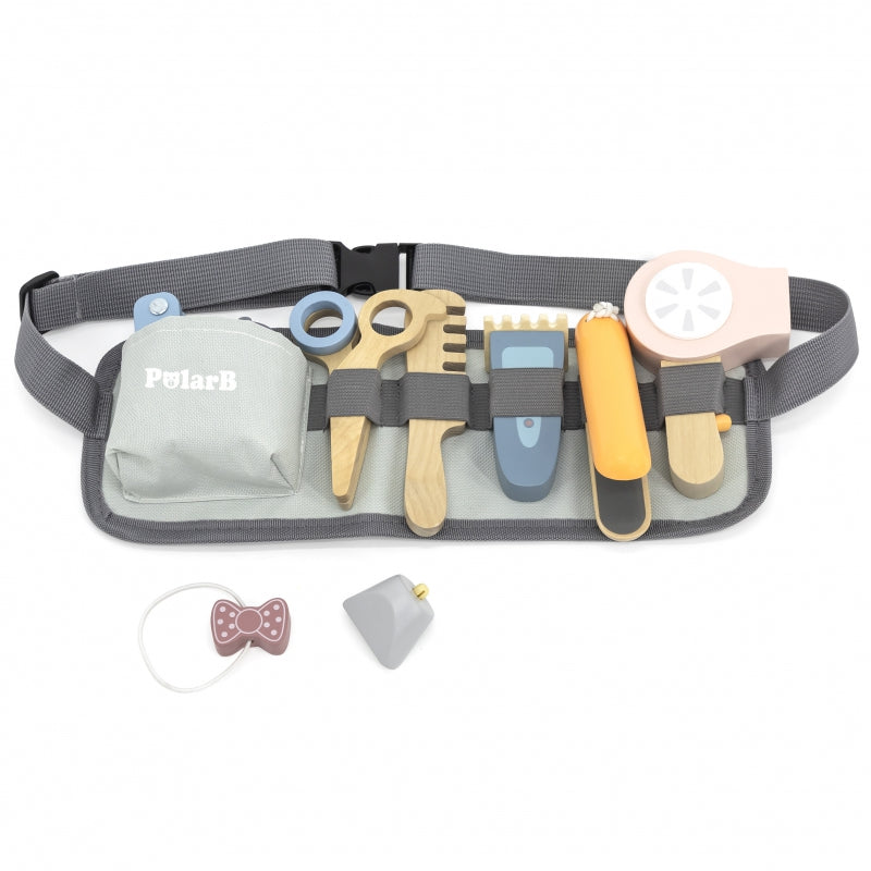 Deze kappersset van PolarB is perfect voor kinderen die graag hun creativiteit en fantasie de vrije loop laten met verschillende rollenspellen. Kleine kappers vinden hier alles wat ze nodig hebben voor leuk knippen, drogen en stijlen . De set bevat een föhn, kam, stijltang, schaar, twee leuke elastiekjes, een tondeuse, een scheermes en een verstelbare riem , zodat kinderen de hele set kunnen dragen en altijd bij de hand hebben. De speeltjes zijn gemaakt van kindveilig hout en niet-giftige verf .