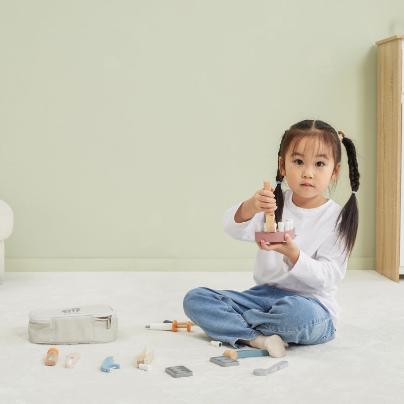 De PolarB houten tandartsset is een van die speeltjes die kinderen door middel van rollenspel helpt hun angst te overwinnen en zelfvertrouwen te krijgen in stressvolle situaties die ze in de toekomst kunnen tegenkomen. Tandartsbezoeken kunnen gemakkelijker en leuker zijn wanneer de angst voor tandheelkundige hulpmiddelen overwonnen is. De set bevat een handige tas met een selectie houten speelgoed, waaronder een gebitsset (inclusief twee extra's), een boor, tandextractors, een tandenborstel, flossdraad, een pincet, röntgenfoto's, een spiegel, een hamer en een tube tandpasta.