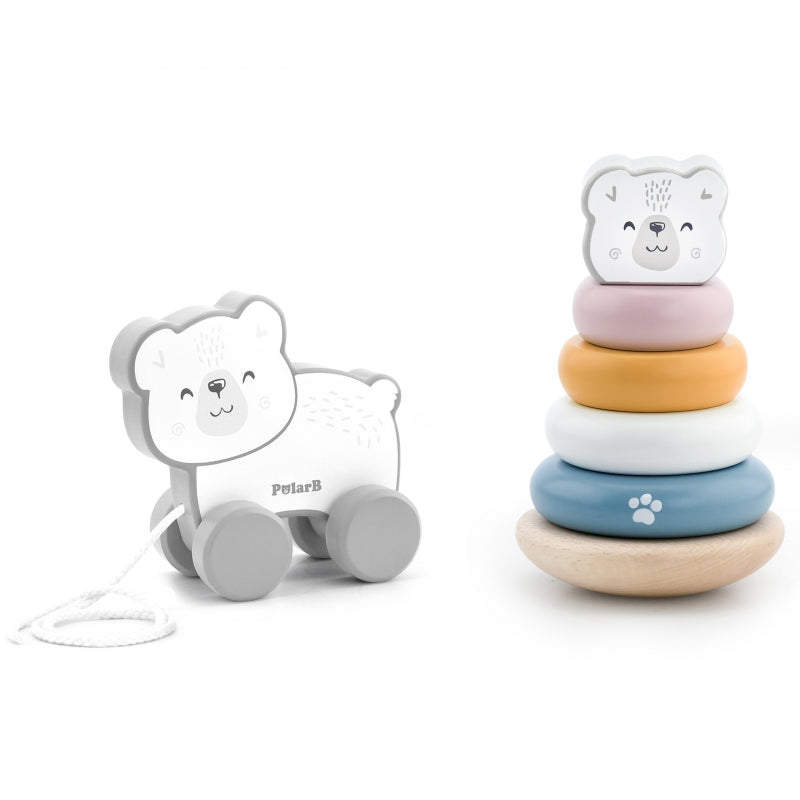 Deze set van PolarB bevat twee pastelkleurige houten speeltjes: een educatieve ijsbeerpiramide en een trekspeelgoed met ijsbeermotief . Beide speeltjes houden je kind niet alleen bezig , maar helpen ook bij de ontwikkeling van de fijne motoriek , het logisch denken en de kleuren .