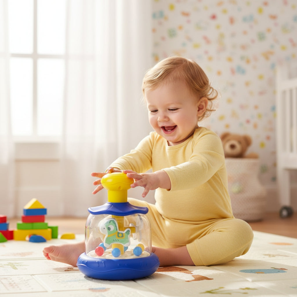 Laat je kind de wereld spelenderwijs ontdekken met de fantastische " Twirly Top "-carrousel! Dit innovatieve en kleurrijke speelgoed is speciaal ontworpen voor de allerkleinste ontdekkingsreizigers en biedt niet alleen enorm veel speelplezier, maar ondersteunt ook hun ontwikkeling op belangrijke gebieden. Dankzij de stevige constructie en levendige kleuren trekt het speelgoed de aandacht van het kind en ondersteunt het tegelijkertijd de ontwikkeling van hun motorische, sensorische en cognitieve vaardigheden. Het is de perfecte keuze voor elke ouder die wil dat hun kleintje zich in een vrolijke en vrolijke sfeer ontwikkelt. Druk gewoon op het bovenste gele deel van de carrousel en het paard en de ballen beginnen door de carrousel te bewegen.