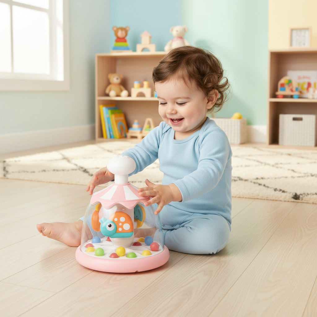Laat je kind de wereld spelenderwijs ontdekken met de fantastische " Twirly Top "-carrousel! Dit innovatieve en kleurrijke speelgoed is speciaal ontworpen voor de allerkleinste ontdekkingsreizigers en biedt niet alleen enorm veel speelplezier, maar ondersteunt ook hun ontwikkeling op belangrijke gebieden. Dankzij de stevige constructie en levendige kleuren trekt het speelgoed de aandacht van het kind en ondersteunt het tegelijkertijd de ontwikkeling van hun motorische, sensorische en cognitieve vaardigheden. Het is de perfecte keuze voor elke ouder die wil dat hun kleintje zich in een vrolijke en vrolijke sfeer ontwikkelt. Druk gewoon op het bovenste gele deel van de carrousel en het paard en de ballen beginnen door de carrousel te bewegen.
