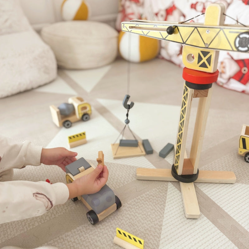 Met deze uitgebreide set kunnen kinderen de rol van ingenieur op zich nemen en een echt mini-bouwproject uitvoeren – van het vervoeren van materialen tot het werken met een kraan en graafmachine.