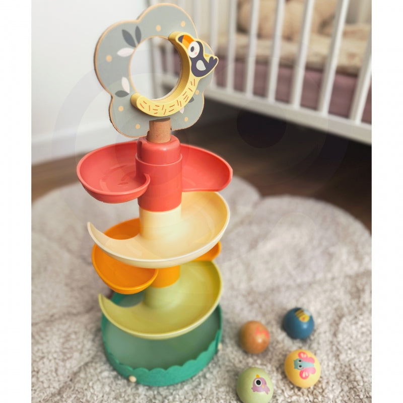 Deze houten ballenbaan is het perfecte sensorische en educatieve speelgoed voor peuters vanaf 18 maanden . De spiraalvormige toren, gemaakt van 6 kleurrijke, eenvoudig in elkaar te zetten elementen, stelt kinderen in staat hun eigen ballenbaan te bouwen. De set bevat 4 lichte ballen met dieren- en muzieknoten-prints, die kinderen kunnen observeren terwijl ze naar beneden rollen – niet alleen leuk, maar ook een uitstekende oefening voor hun ogen en handen. Het bos-thema stimuleert de verbeelding en stimuleert zelfstandig spelen , terwijl het natuurlijke hout en de veilige materialen kwaliteit en duurzaamheid garanderen.