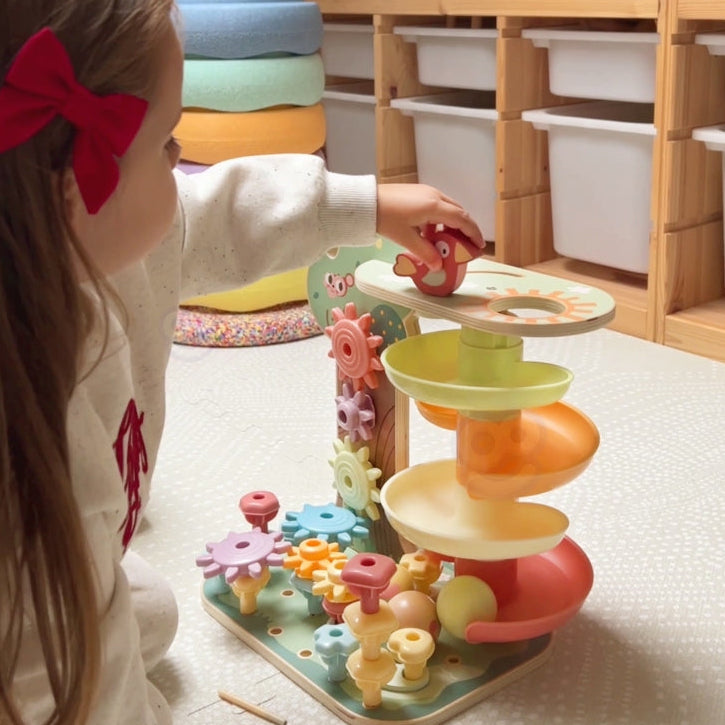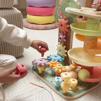 Een kleurrijke ballenbaan, sensorische tandwielen, pinnen en een creatief rijgspeeltje – alles in een prachtige pastelkleurige setting en gemaakt van veilige, duurzame materialen.