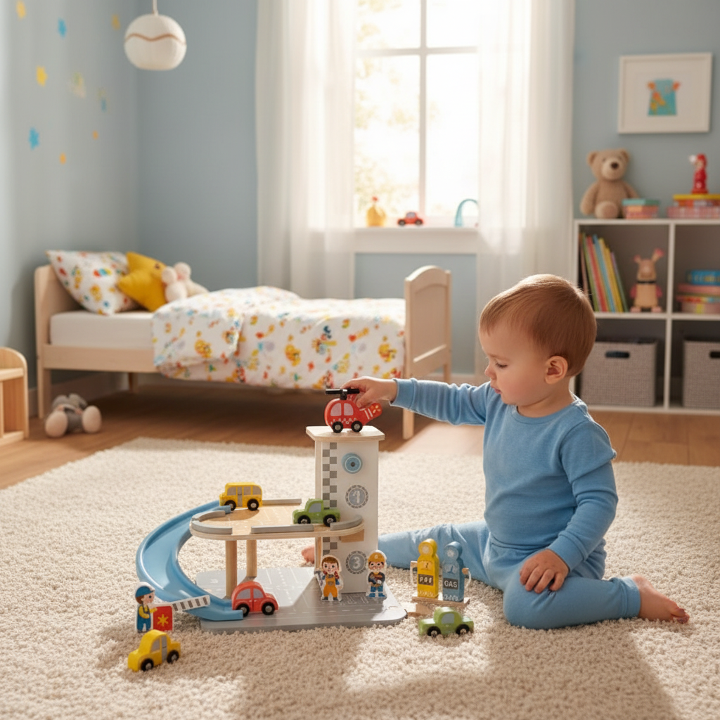 - Creativiteit - Kinderen kunnen de garage vrij indelen, routes bepalen, waar ze parkeren en hoe ze alle elementen gebruiken (hellingbaan, lift, helikopterlandingsplaats). Door het ontbreken van elektronische aanwijzingen kunnen kinderen zelf hun speelscenario's bepalen.